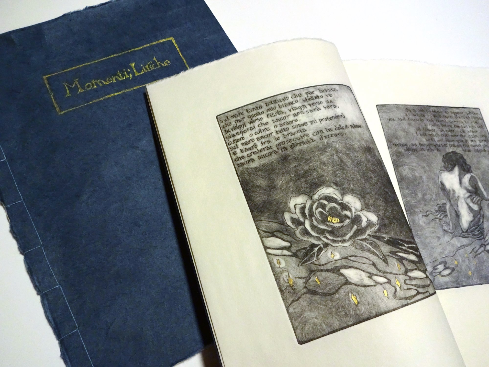 Twelve drypoint plates illustrating three poems from Sibilla Aleramo’s (1876-1960) 1921 book Momenti; Liriche. Poems are depicted in the original Italian alongside new English translations. Aleramo was a prominent feminist who explored her relationship with fellow woman writer Lina Poletti openly in her writing.